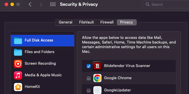 To check if BitdefenderVirusScanner has been granted access to a specific feature, such as Full Disk Access (FDA) — identified by the service kTCCServiceSystemPolicyAllFiles — we can query the per-user database. If the auth_value in the access table is set to 2, this confirms that permission has been granted.