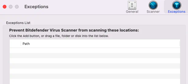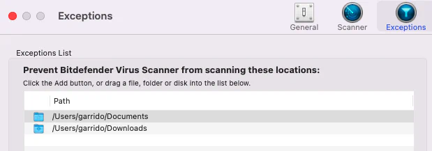default 01:03:43.842093-0400 BitdefenderVirusScanner [+] Exclusions Path [Real]: /Users/garrido/Library/Containers/com.bitdefender.BitdefenderVirusScanner/Data/Library/Application Support/Bitdefender Virus Scanner/antivirus.bundle/exclusions.plist