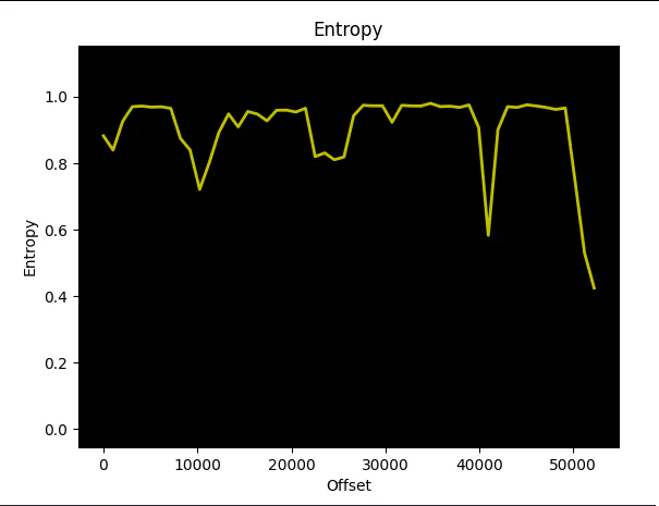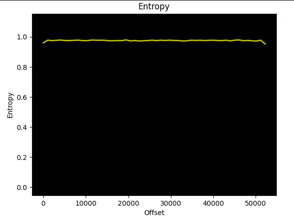 In the following graph, we observe the encrypted PDF entropy (0.980), approaching very close to the point of maximum entropy (1.0), and this value remains nearly constant across the file offsets: