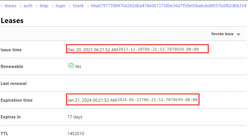 It’s crucial to emphasize that sensitive information from leases, such as credentials, is never visible. Only informative details, such as TTL, Expiration time, Expires In, and Issue Time, are available.