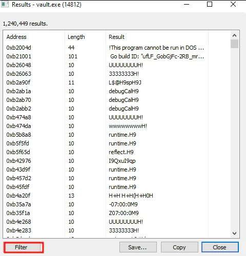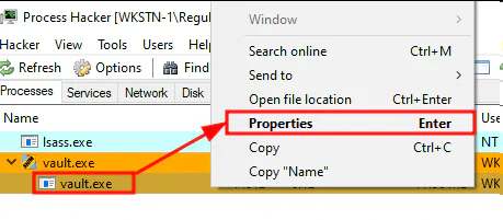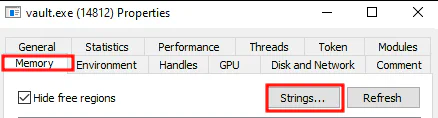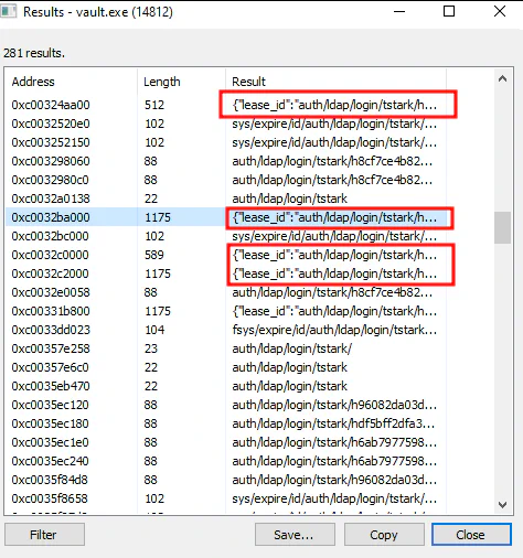 As a proof of concept, we can employ an utility (e.g., Process Hacker) that analyzes the virtual memory space of a process and searches for a pattern that provides the sensitive information we seek—in this case, clear-text credentials and information related to a token within the Vault process: