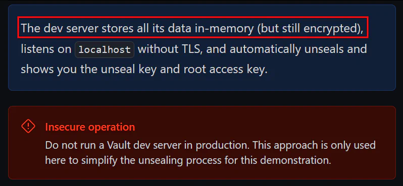 According to the documentation, it’s strongly advised against using a server in development mode within a production environment, as all information is handled in memory. However, it’s noteworthy that despite this, the information is still encrypted—a crucial aspect preventing unauthorized access to secrets and sensitive data.