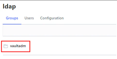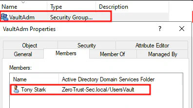 As shown in the next figures, the VaultAdm group includes the user Tony Stark (tstark), who is granted access to Vault using LDAPS authentication: